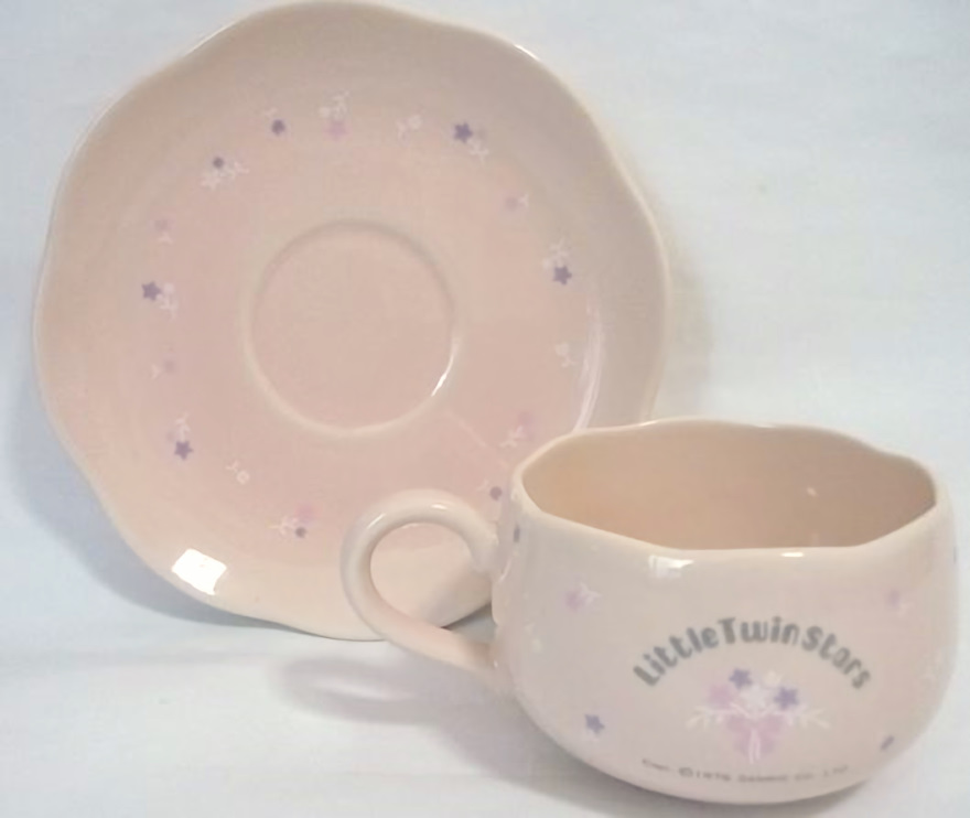 参考に、2012年に発売されたリトルツインスターズファンというムック本(私物)より画像を拝借しています。キキララちゃんの70年代グッズの紹介ページにこのカップ&ソーサーが掲載されています。ティーポットも合わせて3点セットにできるんですね。もともとセット販売だったのかは不明ですが…